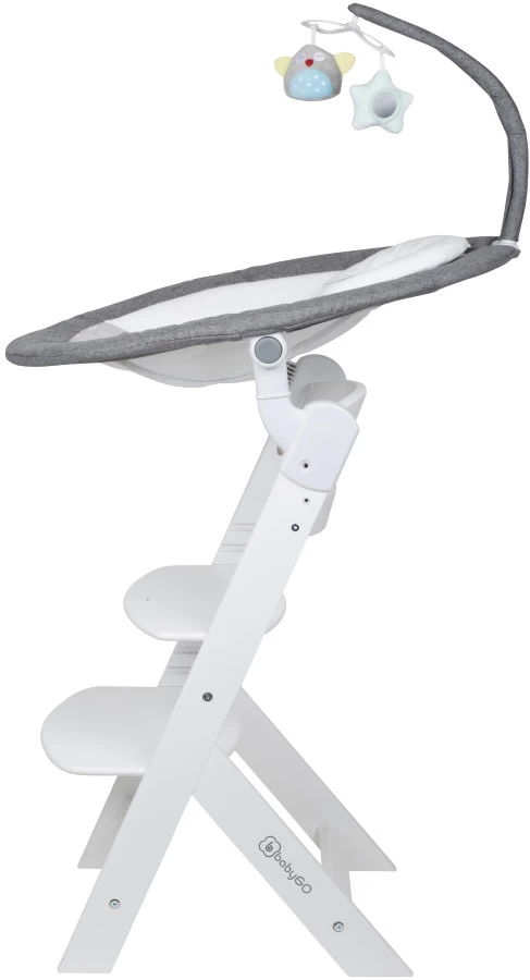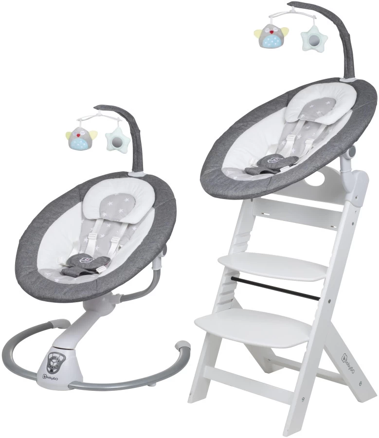 Daarnaast wordt de swing geleverd met een BabyGo Family kinderstoel. De swing is makkelijk op de kinderstoel te bevestigen met de adapters waardoor je je kleine hoger kan zetten om er zo beter bij te kunnen. Van deze kinderstoel is zowel de zitting als de voetensteun in 3 verschillende hoogtes te verstellen zodat er altijd een comfortabele positie voor je kindje te vinden is.